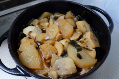 - バーミキュラに大根(半月切り)、里芋、昆布、酒、みりん、砂糖、醤油を入れて、蓋をして弱火で35分加熱する。