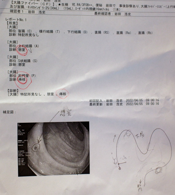 ●2箇所に「憩室」というのがありました。加齢によりできることもあるそうです。また、「痔」もありました。