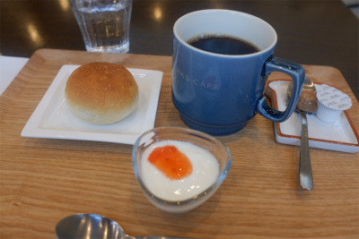 モーニングは小さなパン(温かい)とヨーグルト付きで、495円でした。回りのお店に比べると少し高めではあるけれど、居心地の良いカフェなので、納得。