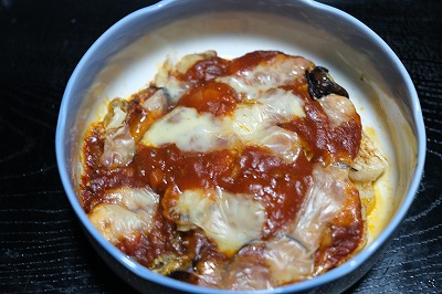 - 耐熱の器に2を並べ入れ、ミートソース、チーズをかける。オーブントースターで4-5分、チーズが解けるまで焼き、パセリをふる。