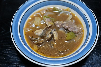 具材は、牛肉、玉ねぎ、スナップエンドウなどの野菜。そして、殻付きのアサリを使いました。