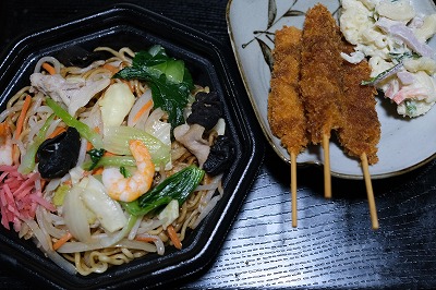 食事の手配もままならず、ヨシズヤで買ってきた焼きそばと串カツが夕食。
