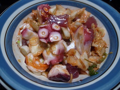深めの器に、ぶつ切りにした刺身用のメバチマグロ、キムチ、刻みネギ、ぶつ切りのタコ、キムチを順に重ねます。その上にラップを敷いて重しをかけ冷蔵庫内で数時間放置します。