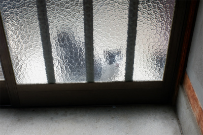 (3)上半身を入れ込み、ガラス戸を開けます。
