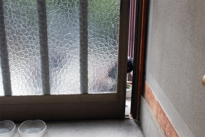 (2)足と顔を使ってガラス戸を少し開けます。