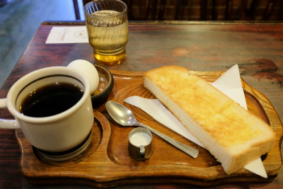 モーニングはコーヒーにトースト、ジャム、ゆで卵の定番です。そして、締めに日本茶がでました。これで300円というのに驚きました。