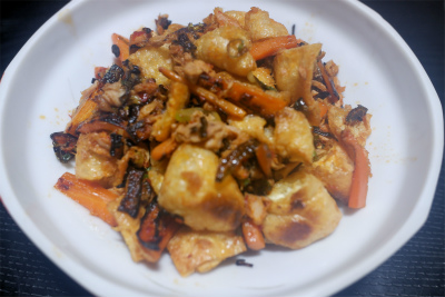 - フライパンに油を熱し、豆腐を炒める。ハム、ゴーヤー、玉ねぎを加えて炒め、醤油、塩こしょうで調味する。