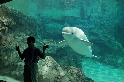 トレーナーと一緒にサヨナラをするベルーガ
