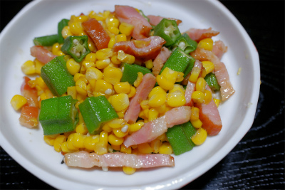 - フライパンにオリーブ油を熱し、ベーコンととうもろこしをさっと炒める。水、酒、塩、こしょうを加え、煮立ったらオクラを加え、汁気が無くなるまで炒める。