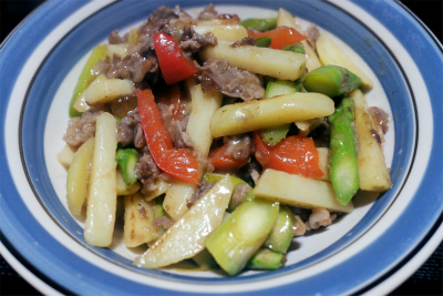 - 油を少々足し、アスパラとじゃがいもを入れて炒める。湯、鶏がらスープ(顆粒)、醤油、酒、片栗粉、砂糖、こしょうを加えて、牛肉を戻し入れ、さっと炒める。