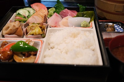 お弁当(刺身大盛版)を頼みました。以前と同じように、手間をかけた色んな料理がお重に入って提供されます。デザートのアイス付きで、税込みで1,400円。