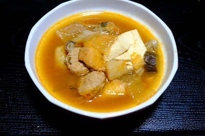 市販品の鍋用辛口つゆを使って、「赤から鍋」を作ってみました。つゆはコチジャン、豆板醤、甜麺醤の三種の醤を使っていて、とても辛そう。 使った具材はいろいろ沢山で、薄切り肉、牡蠣、つくね、白菜、ネギ、大根、しいたけ、豆腐、油揚げ、茄子、玉ねぎ、山芋、大根、ベーコンなど、 作り方は、鍋にスープを入れて温め、具材を投入するだけです(笑)。 かなり辛くて、お酒が進みました。 旨し。