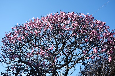 我が家の梅が満開となりました。 遅咲きですが、好天に恵まれ、いつもより早く満開を迎えたようです。 真っ青の空色をバックに、きれいなピンク色の花びらが映えます。