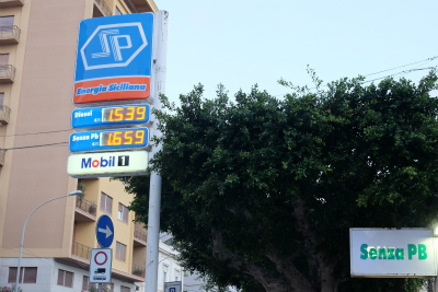 写真はシチリアのトラーパニ市内で撮影したものですが、無鉛(senza pb)ガソリンが1,659ユーロ/リッター。仮に1ユーロ=135円で換算すると1リッターで224円となります。