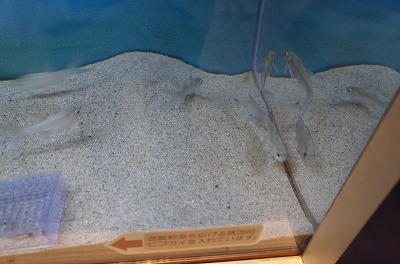 南館2階入り口横にある「発見の玉手箱」のコーナー。毎月展示が替わります。2月はお腹にセンサー搭載したツバメコノシロ です。エサの探し方が特徴的で、遊離軟条(ゆうりなんじょう)と呼ばれる長く伸びた胸びれの一部を広げて海底に潜む甲殻類などの餌を探すそうです。