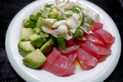 - まぐろは2.5cm角に切り、醤油をからめる。アボカドと長芋は2cm角に切る。器に彩りよく盛り合わせる。