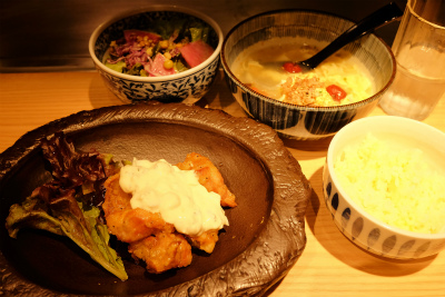 いただいたのは「チキン南蛮となごやコーチンスープ定食」。税込みで1,080円です。ビールは我慢。
