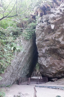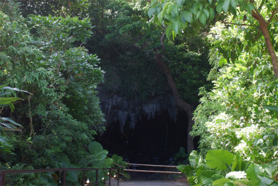 数十万年前の鍾乳洞が崩落してできた亜熱帯の森。ガジュマルの大木、洞窟が点在するところ。ガイドツアー(要予約)のみで入れます。入り口前で撮影。
