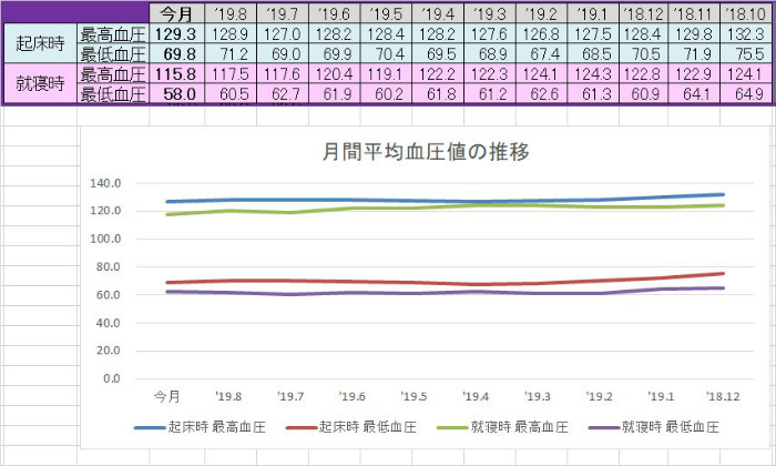最近の血圧(1か月間の平均値)の推移は次の通り。起床時(収縮時)が若干高めですが、なんとか130以内に収まってます。一喜一憂せず。