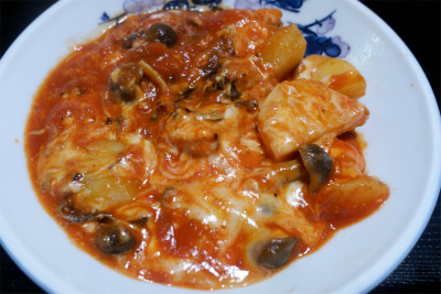 - 2にじゃがいも、しめじを加えてさっと炒め、ホールトマト(缶詰)、水、塩を加えて、トマトを潰し、鮭を戻し入れる。時々混ぜながら、10分ほど煮る。ピザ用チーズを加え、溶けたら器に盛る。