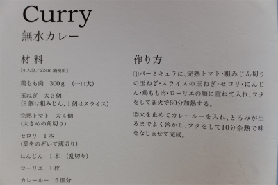 付属のレシピ本を参考にして、定番の「無水カレー」を作ってみました。