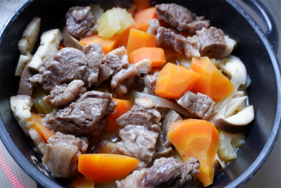 レシピは上掲写真の通り。ただし、鍋のサイズが小さいので、材料の量を半分にしてます。