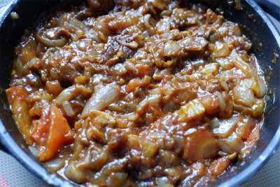 普段食べているカレーとは明らかに違ったカレーでした。とりわけ、水を入れない(=野菜から出たの水分のみ)で、ルーを入れて仕上げたので、こってりとした仕上がりとなったところ。