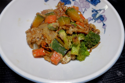 また、鶏肉が使われてますが、お高い牛肉にしました。そして、野菜はレシピ指定のものに加え、しいたけとナスが少しだけ賛助出演。