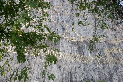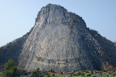 山の岩壁に大きな大仏の絵が書かれていまます。山の高さは100mちょっとあるようです。スライドで大仏の映像を岩壁に投影して絵画したとのこと。作業員はロープで上から吊り下げたようです。