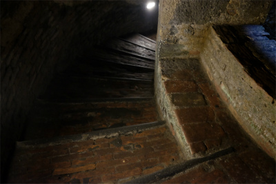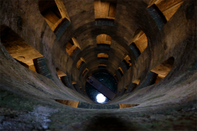 サン・パトリツィオの井戸は16世紀半ばに法王の命で水源確保のために掘られたそうです。深さ62mの井戸の周囲には上下に重なった2つのらせん階段が付けられていて底まで降りることができますが、降りる人と登る人が決して出会わないよう設計してあるのが特徴。