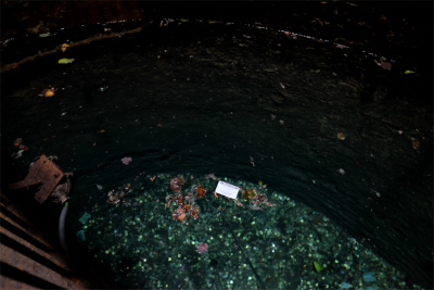 下に溜まった水。たくさんのコインが投げ込まれています。