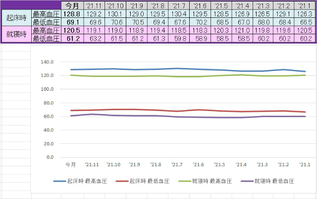 血圧の推移は下表の通り。寒いわりには、安定していると思います。