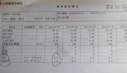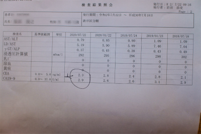 CEAとCA19-9が膵臓がんのマーカーです。ともに基準値内にあります。因みに、膵臓がんになると、桁違いに数値が上がるそうです。