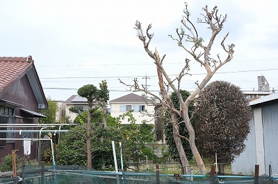 南東のユーカリは背高が4-5mになりました。広がりかけていた枝葉をいったん落としました。