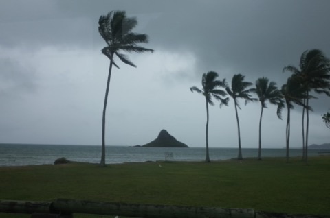 Hau’ulaに向かう途中に見える小島。その形からチャイナマンズハットと呼ばれてます。天気悪し。