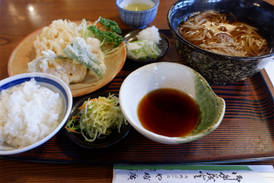 そば定食(税込み830円)をいただきました。ヘルシーな野菜天ぷらがついて、美味しかったです。