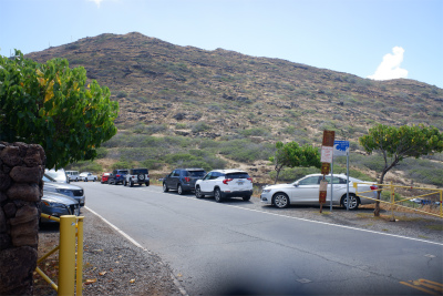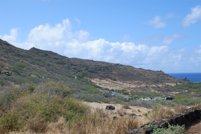 そして、右方向には、今から向かうマカプウ岬。左の中段くらいのところに突起物があリますが、あれがマカプウ灯台です。なお、トレイルの入り口は写真の右側となります。