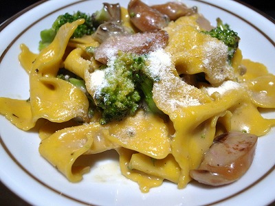 いただき物のパスタを使って、ブロッコリー、舞茸、ウインナー入りのクリームパスタを作りました。