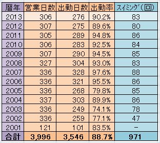 今年は306営業日中、276日の「出勤」でした。水泳は90回のうち、83回受講。