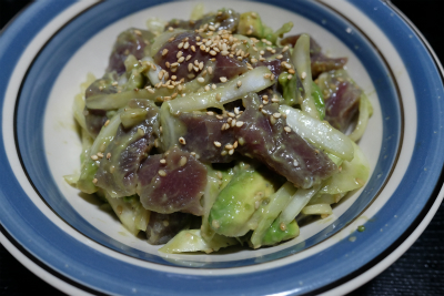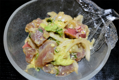 因みに、「アヒポケ」はハワイ料理のひとつで、「アヒ」は「マグロ」を意味し、「ポケ」(「ボケ」ではありません。)は「賽の目切り」を意味します。