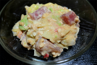 マグロのお供には、玉ねぎ、アボカド、辛子明太子、ひきわり納豆が参加。これらを、醤油、ごま油、マヨネーズ、塩コショウ、赤唐辛子、パウダーにんにくで和えてみました。