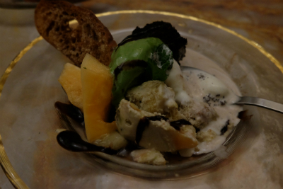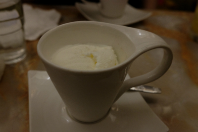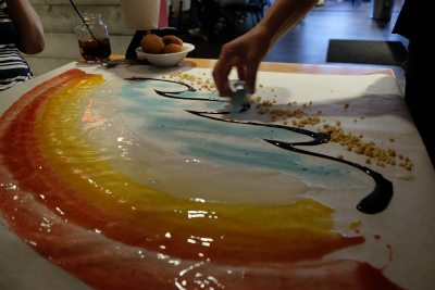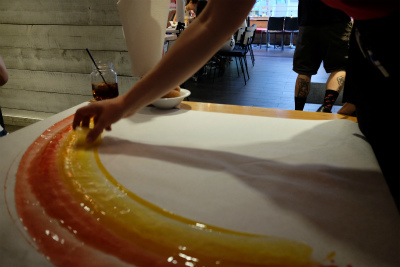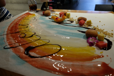 続いて、デザートです。これもユニーク。テーブルにスタッフが絵を書いていきます。