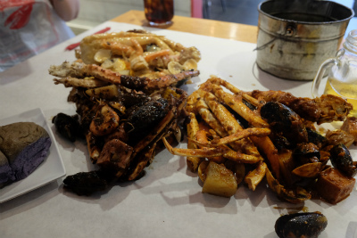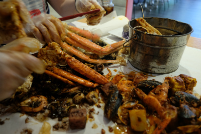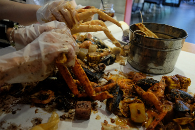 地元ハワイ産の厳選されたエビ、カニなどの食材を特製のスパイシーソースで味付けしたケイジャン料理を手づかみでワイルドに味わう-というのがお店のコンセプト。開店から三年経ちますが、日本でもハワイ番組で紹介され、知る人ぞ知るお店となっています。