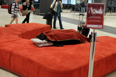ローマ空港での写真です。大きなクッションの上に女性が毛布をかぶって寝ていました。