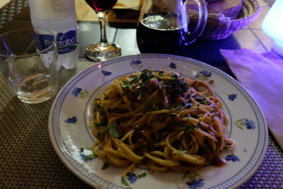 メインはトラーパニ家庭風パスタ。日本でお目にかかったことない太いパスタ。これも旨し。