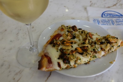お昼はシーフードピザと白ワイン。ともに旨し。