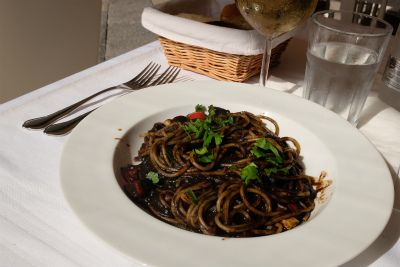 ランチは伝説のイカスミパスタ。