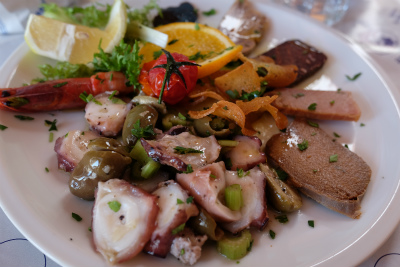 タコ、マグロ、エビ、イワシなどの海鮮の盛り合わせ。塩辛い。ワインが進みます。
