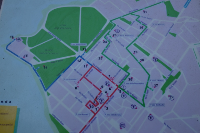 この地図で、6がマードレ教会、12がヌオーヴァ門。そして、左上の緑の部分が考古学公園。水色部分は海です。