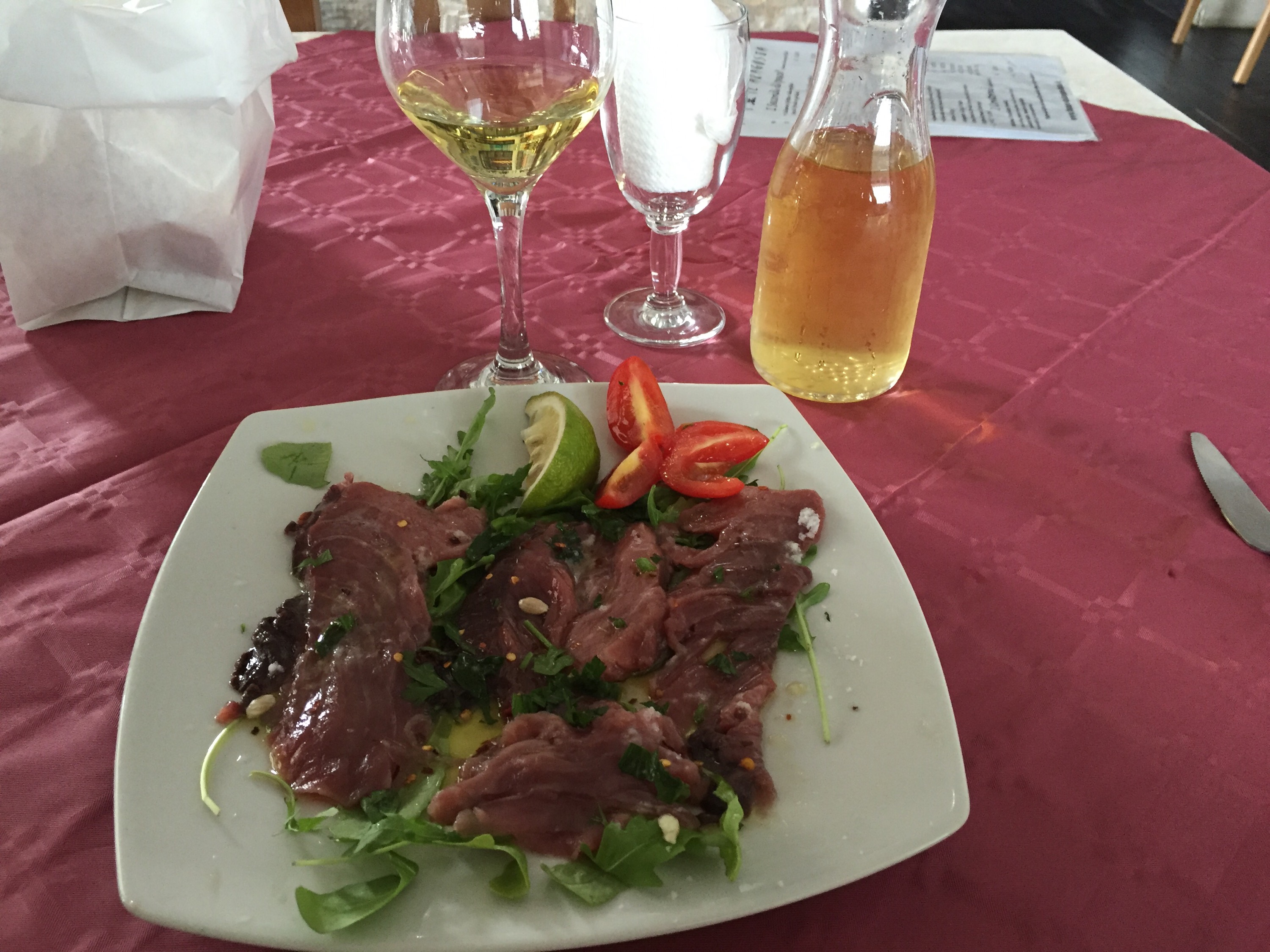 お昼は近くのレストランで、まずはマグロのカルパッチョ。